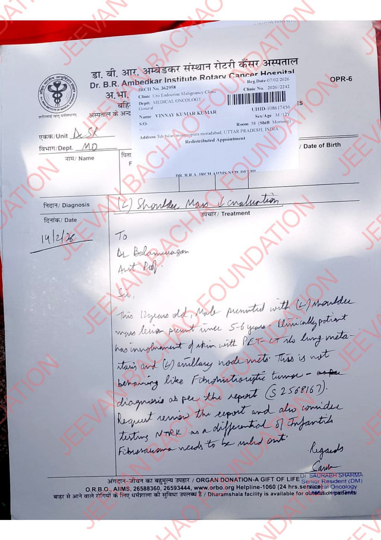 I hope this message finds you well. My name is Vinnay Kumar, I am 11 Years Old old only,basically I belong from Uttar Pardesh, and I am reaching out to you with a heavy heart but hopeful spirit. Recently, I was diagnosed with Bone Cancer (Shoulder), and I am now embarking on a challenging journey towards recovery I am humbly reaching out to request your support in the form of a donation to assist with my medical expenses.